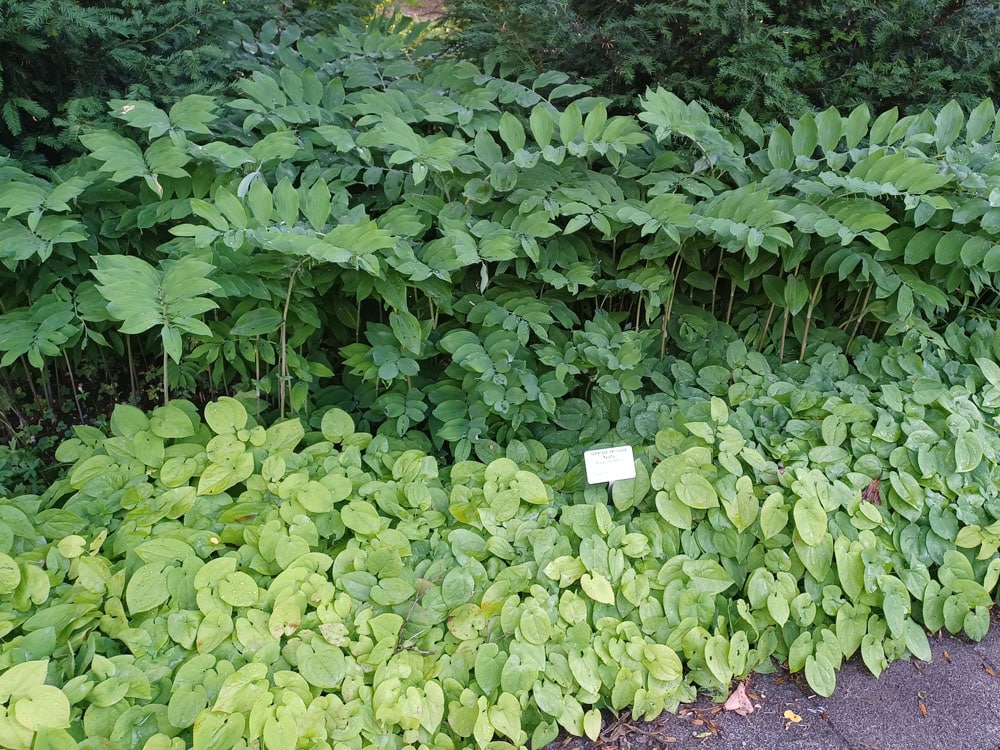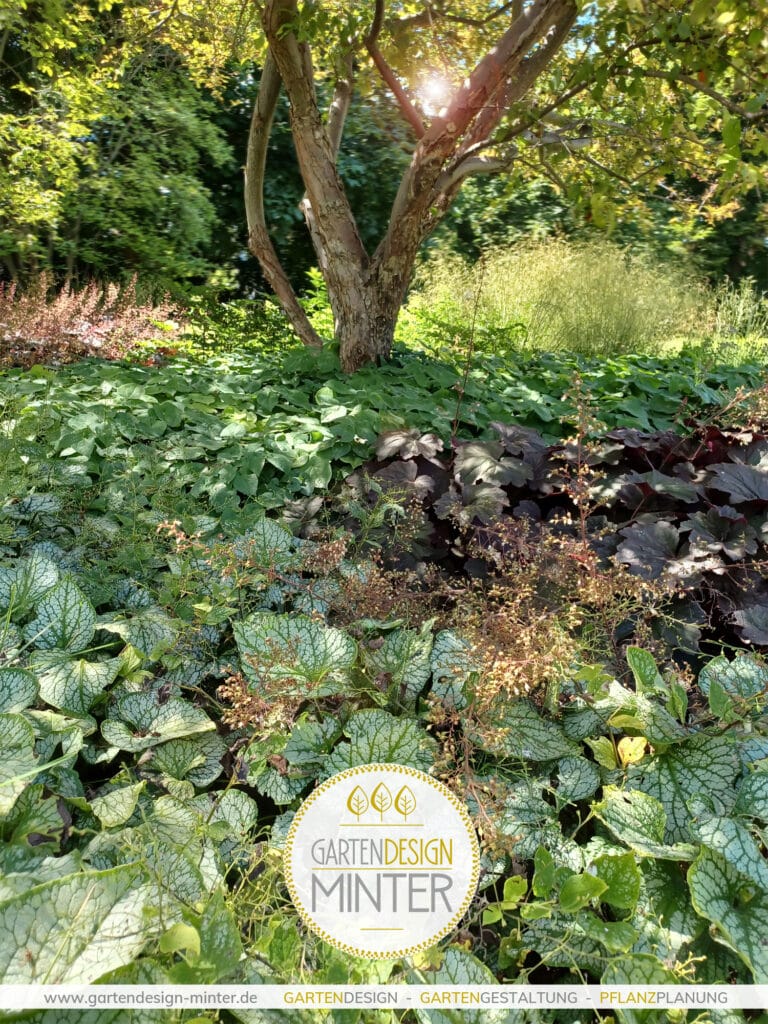Zudem ergänzen sie sich farblich und strukturell sehr gut. Die unterschiedlichen Blattformen, Farben und Blütezeiten sorgen für ein abwechslungsreiches und zugleich harmonisches Gesamtbild. Man kann sie alle drei als Blattschmuck-Stauden bezeichnen, da sie durch schöne Blattformen und Farben charakterisiert sind. Besonders das Sortiment der Heuchera bietet, je nach Sorte, eine große Auswahl an Blattfarben und Blattzeichnungen angefangen von grün über rot bis hin zu Aubergine- oder Brauntönen. Zudem haben sie alle drei eine ähnliche Wuchshöhe und bilden mit ihrem dichten Blattwerk bei flächiger Bepflanzung einen durchgehenden Teppich.