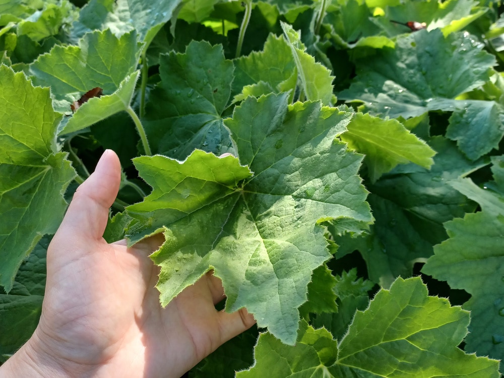 Laub: Die großen, samtigen Blätter dieser Heuchera sind in einem hellen apfelgrünen Ton gefärbt und haben eine leicht behaarte Textur. Die Blätter bleiben lange attraktiv und verleiht Ihrem Beet somit über einen längeren Zeitraum hin Struktur. Im Herbst können sich die Blätter in attraktive Bronze- oder Rottöne verfärben, was zusätzliche saisonale Farbe bietet. Im Vergleich zu anderen hat diese großblättrige Heuchera hier ein eher schlichtes Laub, wirkt aber dadurch sehr natürlich. Dadurch, dass diese Heuchera sich optisch etwas zurücknimmt, lässt sie sich gut mit anderen Stauden, insbesondere Blattschmuckstauen, kombinieren ohne, dass es zu überladen wirkt. Wer doch etwas mehr Farbe braucht, dem empfehle ich die Sorte ‘Brownies‘. Ihr Laub ist in grünen und braunroten Tönen gefärbt. Insbesondere die Blattunterseiten sind mit ihrer bräunlichen/violetten Färbung ein Hingucker.