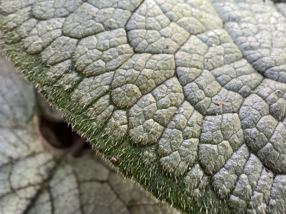 Laub: Die großen herzförmigen, rauen Blätter sind silbrig-weiß und mit einer Blattzeichnung in Form eines netzartigen Muster aus grünen Adern durchzogen. Diese auffällige Zeichnung erweckt den Eindruck, als wären die Blätter mit Raureif überzogen. Dies verleiht der Pflanze einen besonderen Glanz und sorgt für einen Hauch von Helligkeit in schattigen Gartenbereichen. Die Blätter bleiben lange in den Herbst hinein attraktiv und geben somit Ihrem Beet Struktur.