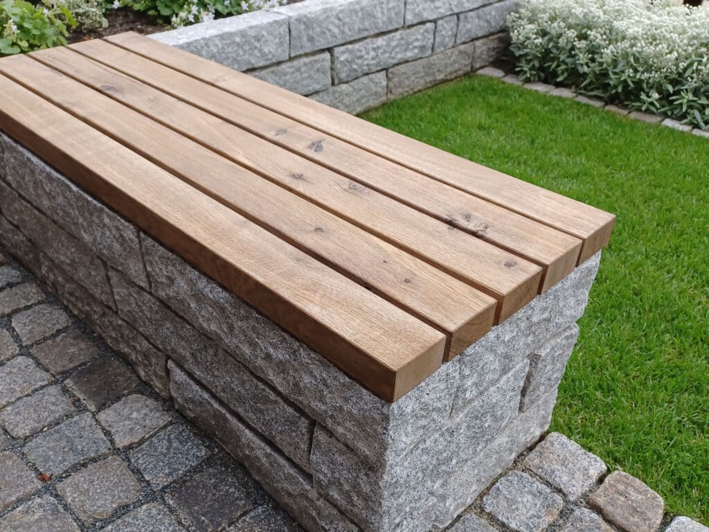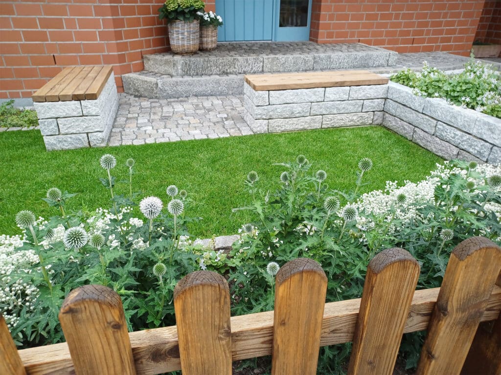 In Anlehnung an die Formgebung des restlichen Gartens wurde hier der Vorgarten auch in geradliniger und somit zueinander passenden Formensprache gestaltet zur Schaffung eines harmonischen und stimmigen Gesamtbildes des Gartens. Zugunsten der Pflegeleichtigkeit des Gartens sprachen sich die Gartenbesitzer für weniger Beetflächen und mehr Rasenfläche aus. Zudem sollte die Fläche besser strukturiert werden, um ein ordentliches und zugleich spannendes Gesamtbild für den Betrachter im Vorgarten zu erzeugen. Neben diesmal auch zukünftig größentechnisch passenden Gehölzen waren blühende Stauden mit dem Farbkonzept "Weiß" Bestandteil des Pflanzplans. Highlights dieser Gartengestaltung sind hier die Hochbeete aus Granit, die einerseits einen optischen Hingucker bieten und andererseits dabei helfen die Fläche zu gliedern. Darüber hinaus ermöglichen sie eine rückenschonende Beetpflege. Der Naturstein Granit wurde gewählt, da dieser bereits in Pflasterflächen und Rasenkanten im restlichen Garten verbaut wurde und somit passend ist zu diesen bestehenden Elementen. Die integrierten Sitzbänke nahe der Haustür bieten eine Abstellmöglichkeit für volle Einkaufstaschen und schaffen einen einladenden Eingangsbereich. Wie die Gartenbesitzerin schilderte, tummeln sich hier regelrecht Kinder, Enkel oder Freunde vor der Haustür zur Begrüßung und nach Besuchen zum Abschied. Mit der neuen Gestaltung ist endlich Platz dafür da und der passende Rahmen dazu entstanden.