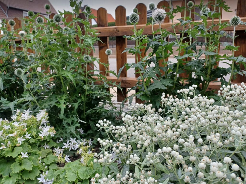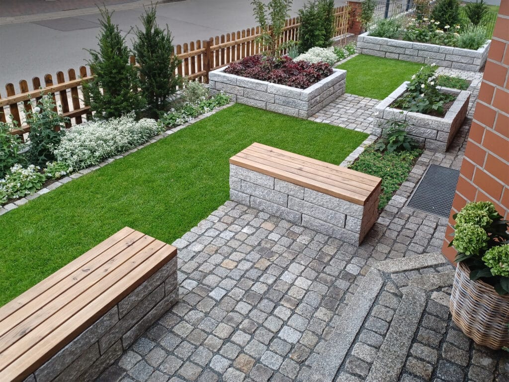 Abgesehen von der Rodung der alten Gehölze erledigten die Gartenbesitzer alle Arbeiten zur Umsetzung des Gartenplans komplett selbst in Eigenleistung. Hut ab, das Ergebnis kann sich sehen lassen! Diese Arbeiten umfassten die Erweiterung der Pflasterfläche vor der Haustür, Bau von Hochbeeten, Einbau von Rasenkanten, Aufstellen von Sichtschutzzäunen, Aufbringen von Mutterboden und des Rollrasens und Pflanzung aller Pflanzen.