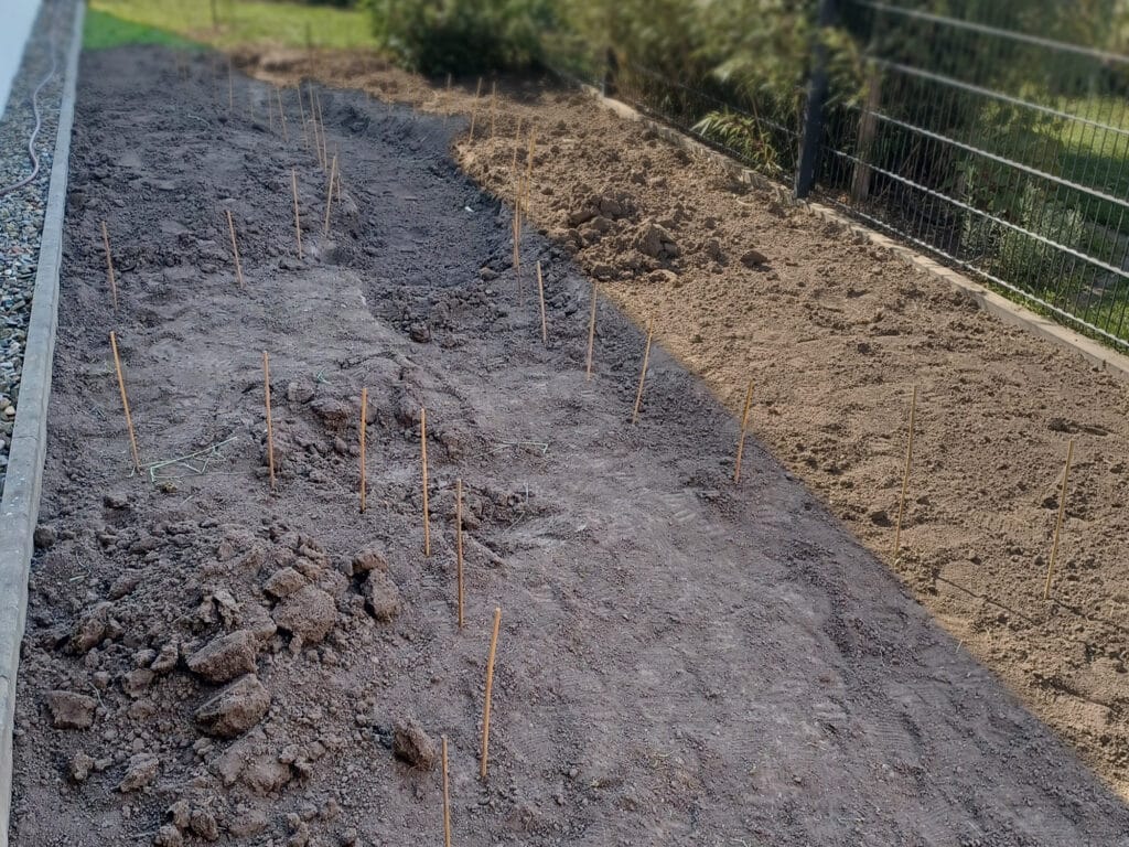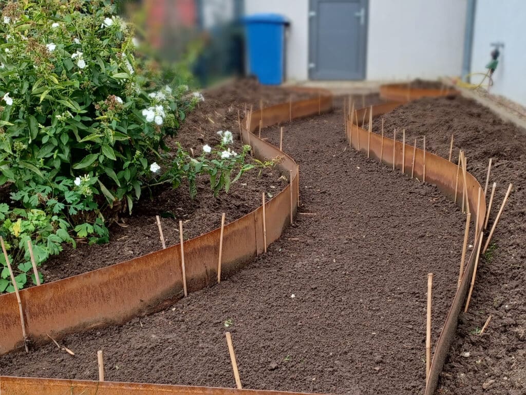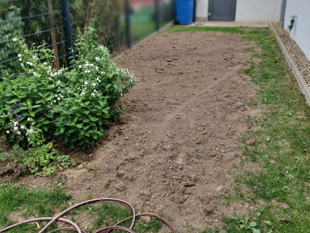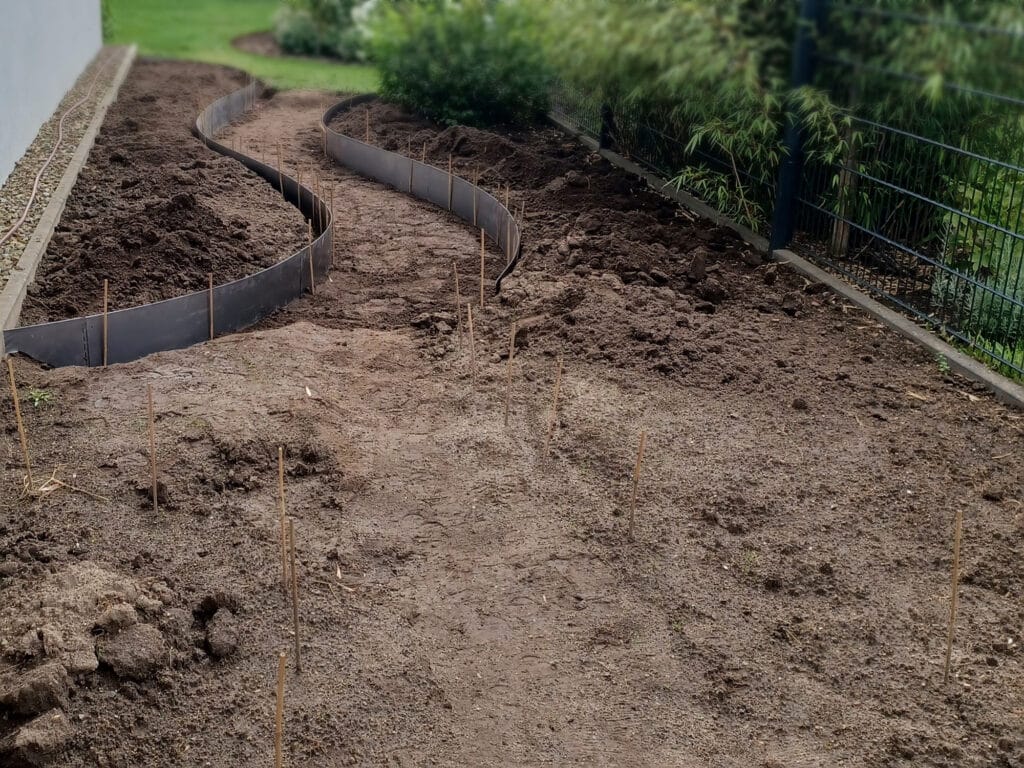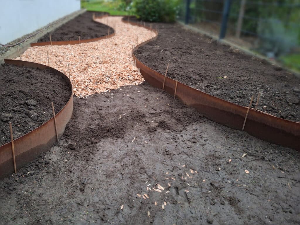 Ein echtes Do-it-yourself Projekt! Die Umsetzung des Plans übernehmen die Gartenbesitzer komplett selbst – noch ist nicht alles fertig, work in progress! Der Rasen wurde bereits entfernt, die Wegbegrenzung aus Cortenstahl gesetzt und der Pfad mit einer ersten Lage Holzhackschnitzeln aufgefüllt. Er wird später noch mit einem optisch ansprechenderen Mulch aus Pinienrinde überdeckt. Auf einen Wegebelag aus Stein oder Pflaster wurde hier bewusst verzichtet, nicht nur zugunsten des bereits erwähnten Wald-Themas. Die Umsetzung sollte nach Wunsch möglichst kostengünstig und ohne zu großen Aufwand in Eigenleistung durch die Gartenbesitzer lebst zu erledigen sein. Auch einige erste Pflanzen durften schon in den neu gestalteten Gartenbereich einziehen. Weitere werden folgen.